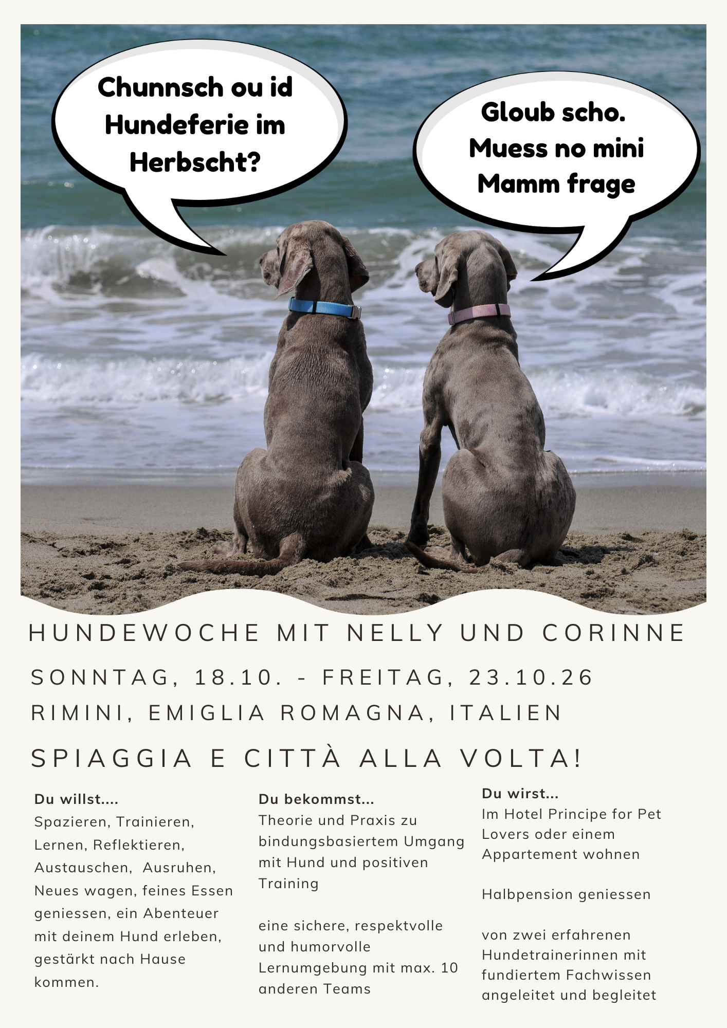 Hat das Abenteuer bereits begonnen oder bist du erst am Träumen? Ich begleite dich ab Tag 1 mit Praxis und Wissen. Trainings, Besuche bei dir Zuhause, Zoom-Stunden für Fragen und Theorie, Whatsapp-Begleitung und Trainingstagebuch. Paket à 5 Praxislektionen und 3 Zoommeetings.